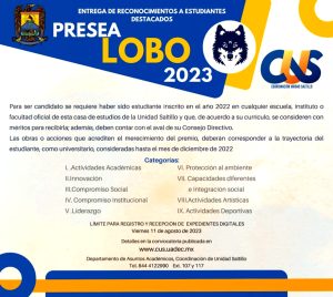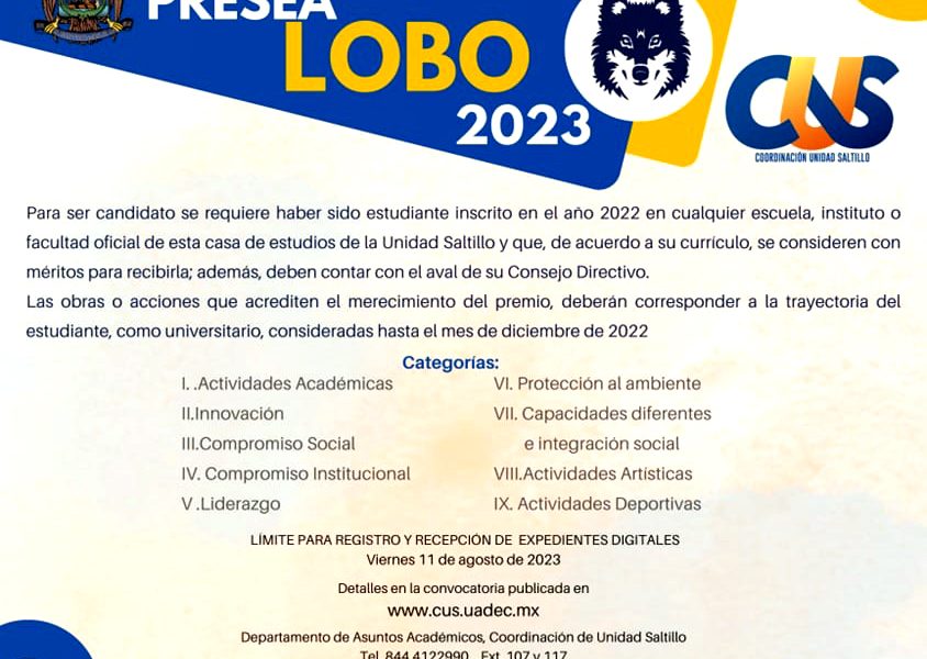 16 Junio 2023; Saltillo, Coahuila.- La Universidad Autónoma de Coahuila a través de la Coordinación de Unidad Saltillo, convoca a los alumnos de Escuelas, Facultades e Institutos a postularse a la Presea Lobo 2023, galardón que reconoce a estudiantes destacados en diversos ámbitos.