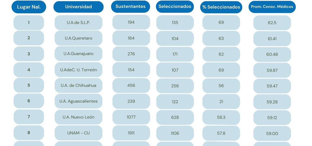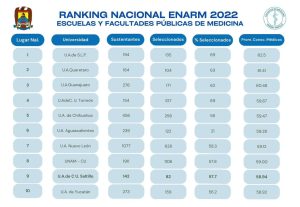 21 Junio 2023; Saltillo, Coahuila.- Felicito a las comunidades universitarias de las Facultades de Medicina Unidad Torreón y Unidad Saltillo por encontrarse en el Ranking Nacional entre los primeros 10 lugares de las Escuelas y Facultades Públicas de Medicina del Examen Nacional de Aspirantes a Residencias Médicas. Además nuestro egresado Eduardo Ichikawa Escamillade de la Escuela de Medicina Piedras Negras de los 49 mil 802 médicos que presentaron el ENARM obtuvo el lugar 97 ¡Enhorabuena!
