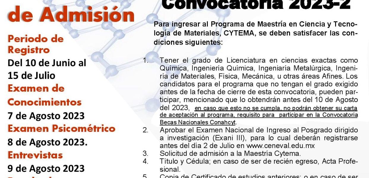 Además, 2. Aprobar el Examen Nacional de Ingreso al Posgrado dirigido a Investigación (EXANI III) 3. Solicitud de admisión a la Maestría CYTEMA; 4. Título y Cédula; en caso de ser de recién egreso, presentar acta Profesional; 5. Certificado de estudios anteriores; o en caso de ser de recién egreso, Kárdex oficial; 6. Aprobar el examen de conocimientos aplicado por el programa de posgrado; 7. Comprobar conocimientos del idioma inglés, equivalentes a 400 puntos de TOEFL; 8. Carta de motivos, formato libre; 9. Dos cartas de recomendación académica; 10. Curriculum Vitae y 11. Dos Fotografías.