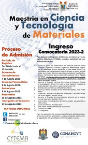5 Julio 2023; Saltillo, Coahuila.- La Facultad de Ciencias Químicas de la Universidad Autónoma de Coahuila, convoca a egresados de licenciatura en ciencias exactas o de ingeniería en materiales, química, mecánica, metalurgia u otras áreas afines, a postularse para ingresar a la Maestría en Ciencia y Tecnología de Materiales para el semestre agosto-diciembre de 2023.
