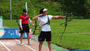 7 Julio 2023; Saltillo, Coahuila.- La arquera coahuilense Ángela Ruiz conquistó la Medalla de Bronce en el Arco Recurvo Individual Femenil, dentro de los Juegos Centroamericanos y del Caribe San Salvador 2023.