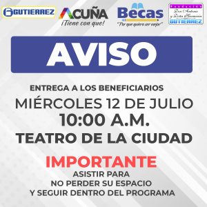 11 Julio 2023; Acuña, Coahuila.- Como fue reprogramado, el miércoles 12 de julio, en el Teatro de la Ciudad, la Dirección de Desarrollo Social entregará becas para estudiantes de preparatoria y universidad dentro del programa «Porque quiero ser Mejor».