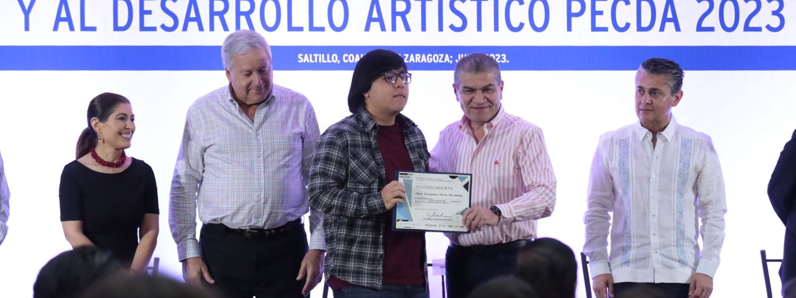 15 Julio 2023; Saltillo, Coahuila.- El gobernador Miguel Ángel Riquelme Solís, junto al alcalde José María Fraustro Siller, entregaron apoyos a los 44 ganadores del Programa de Estímulos a la Creación y Desarrollo Artístico Coahuila 2023 (PECDA), que tiene como objetivo impulsar la consolidación de proyectos culturales y artísticos de creadoras y creadores beneficiarios de este programa.