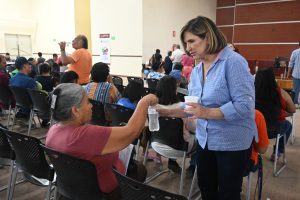 Encabezando a un equipo de trabajadores del DIF Municipal, la doctora Leticia Carrillo hizo entrega de la bebida hidratante a las personas que se encontraban en espera.