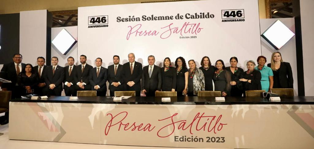 26 Julio 2023; Saltillo, Coahuila.- En sesión solemne de Cabildo y en el marco del 446 aniversario de la ciudad, el alcalde José María Fraustro Siller y el gobernador Miguel Ángel Riquelme Solís entregaron la Presea Saltillo 2023, el máximo reconocimiento del municipio a quienes han contribuido al desarrollo de la capital de Coahuila.