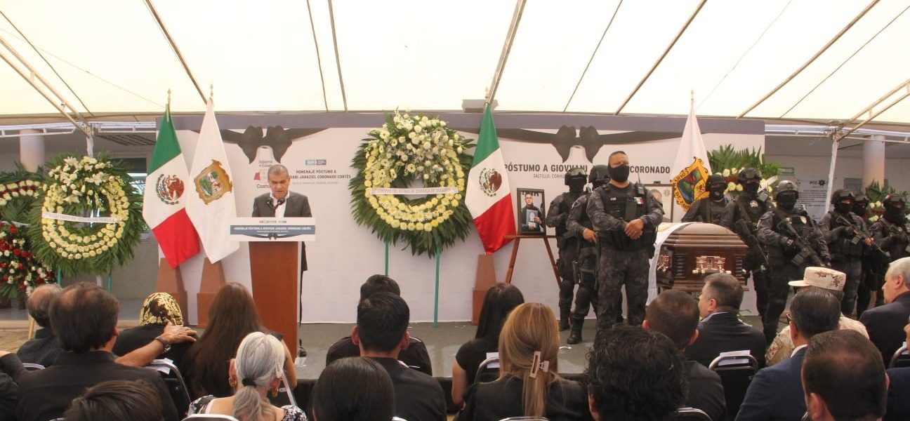 28 Julio 2023; Saltillo, Coahuila.- Al encabezar el homenaje póstumo del policía estatal Giovani Jahaziel, quien perdió la vida en enfrentamiento con civiles armados, el gobernador Miguel Ángel Riquelme Solís expresó que Coahuila mantiene el control de la seguridad y que prevalecerán los operativos y acciones interinstitucionales en contra del crimen para evitar el ingreso de grupos delincuenciales a nuestro territorio.