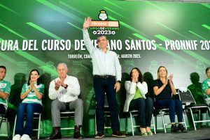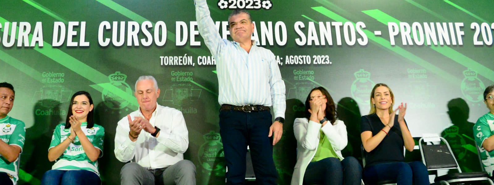 Acompañado por Manyra Hernández Sabag, Directora Ejecutiva del Club Santos Laguna, y por María Leticia Sánchez Campos, Procuradora de Niños, Niñas y la Familia del Estado, Riquelme Solís mencionó que el que hoy se reunieran en el Territorio Santos Modelo se debe a un esfuerzo conjunto, por lo que agradeció a la Directiva del Santos, a las alcaldesas y alcaldes, y a las niñas, niños y jóvenes participantes.