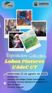 15 Agosto 2023; Torreón, Coahuila.- La Universidad Autónoma de Coahuila a través de la Coordinación de Unidad Torreón y su Departamento de Difusión Cultural, extiende al viernes 18 de agosto de 2023 el plazo para la recepción de obras a participar en la Exposición Colectiva “Lobos Pintores UAdeC UT”.