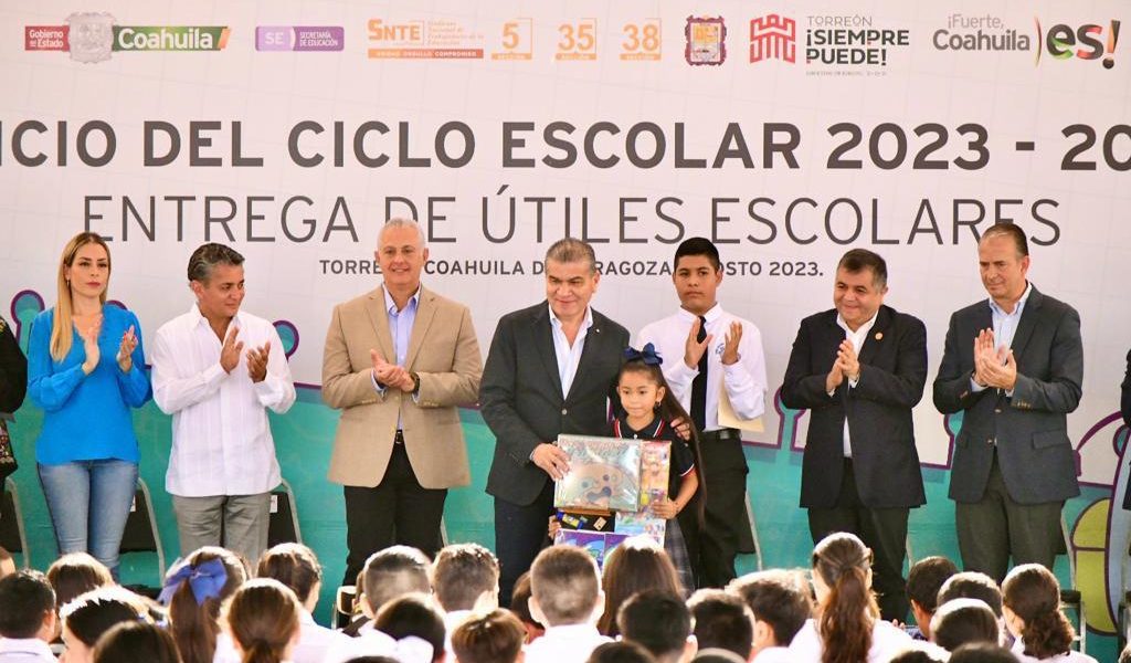 29 Agosto 2023; Torreón, Coahuila.- El alcalde de Torreón, Román Alberto Cepeda González, y el gobernador de Coahuila, Miguel Ángel Riquelme Solís, dieron inicio al ciclo escolar 2023 – 2024, y entregaron útiles escolares para estudiantes de diferentes niveles educativos en el Estado.