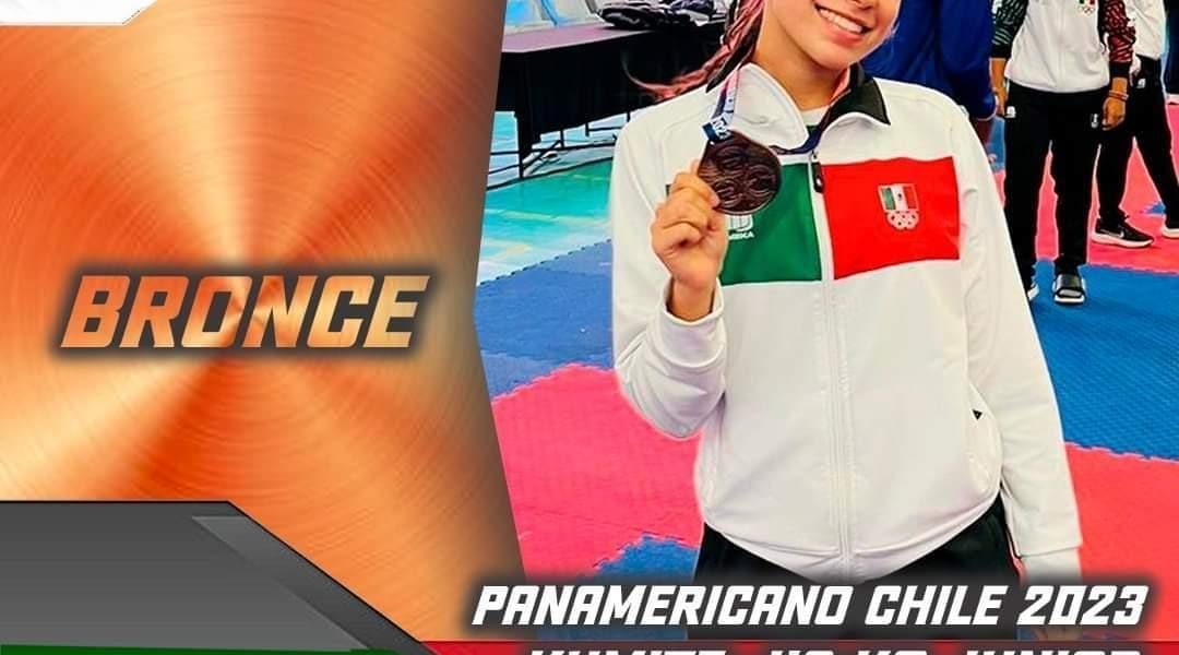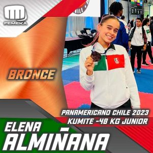 31 Agosto 2023; Saltillo, Coahuila.- La coahuilense Elena Almiñana Flores subió al podio del Campeonato Panamericano Juvenil, Cadete y Sub 21 de Karate, evento que se llevó a cabo en Santiago de Chile.