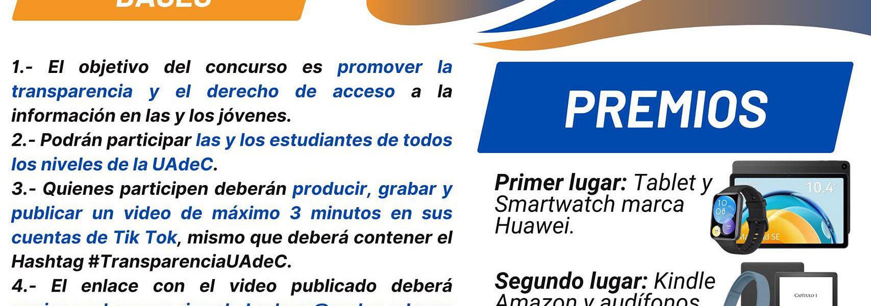 Está dirigido a las y los estudiantes de la comunidad universitaria de todos los niveles; para participar deberán producir, grabar y publicar un video en sus cuentas de TikTok, el cual promueva el derecho a la información, deberán tener una duración máxima de 3 minutos, así como contener el Hashtag #TransparenciaUAdeC.