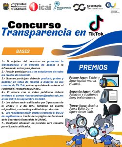 7 Septiembre; Saltillo, Coahuila.- Con el objetivo de promover el ejercicio del Derecho al acceso a la Información pública y la Transparencia entre los jóvenes, la Universidad Autónoma de Coahuila a través de la Secretaría General y la Coordinación de Extensión Universitaria, en conjunto con el Instituto Coahuilense de Acceso a la Información Pública (ICAI), invita a participar en el “Concurso Transparencia en TikTok”.