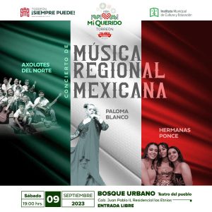Mientras que para el sábado 09 de septiembre, se dará espacio a la música regional, con la presentación al aire libre del grupo infantil “Los ajolotes del norte”, Paloma Blanco y las Hermanas Ponce.
