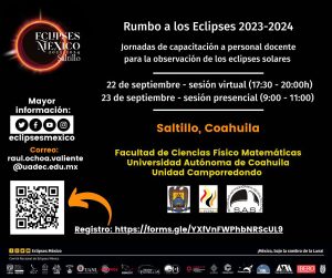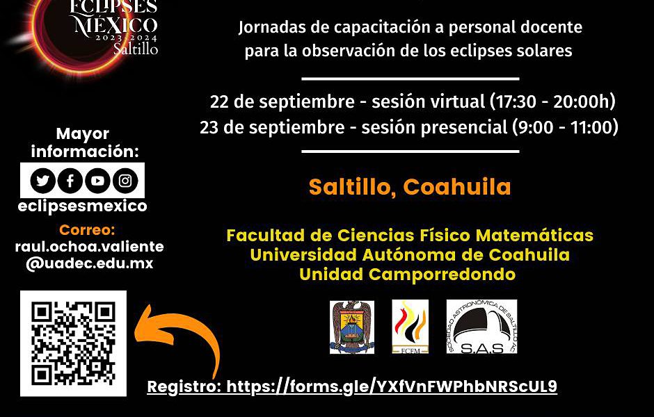 21 Septiembre 2023; Saltillo, Coahuila.- La Facultad de Ciencias Físico Matemáticas de la Universidad Autónoma de Coahuila en colaboración con el Comité Nacional de Eclipses México 2023-2024, la Sociedad Astronómica de Saltillo y el Museo del Desierto convocan a docentes de Saltillo y zonas aledañas a participar de la “Jornada de Capacitación a Personal Docente para la Observación de Eclipses Solares”.