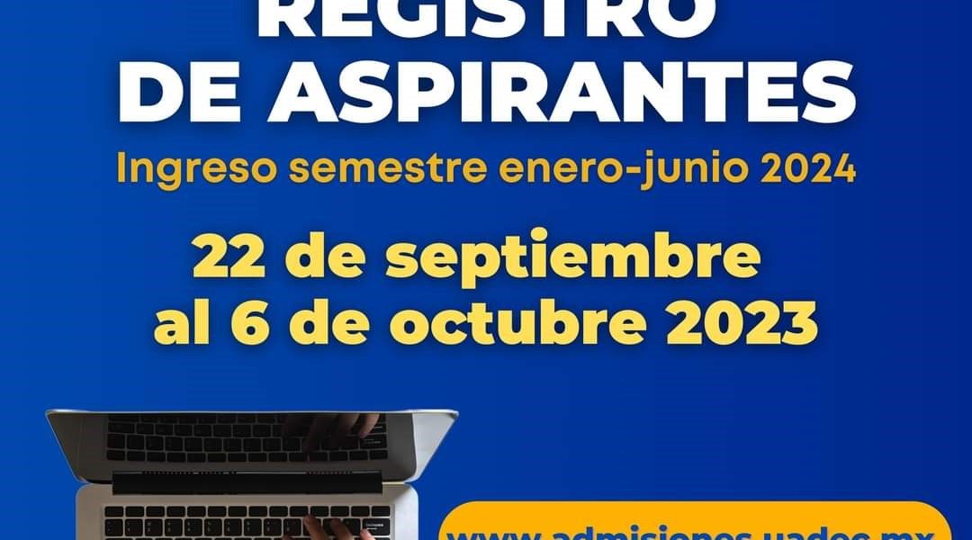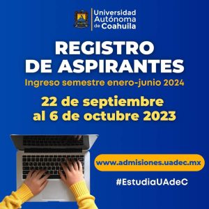 22 Septiembre 2023; Saltillo, Coahuila.- Del 22 de septiembre al 6 de octubre de 2023, la Universidad Autónoma de Coahuila abre el registro para aspirantes de Bachillerato y Licenciatura que deseen ingresar a la máxima casa de estudios para el semestre enero-junio 2024, el proceso es por medio del portal web de Admisiones www.admisiones.uadec.mx.