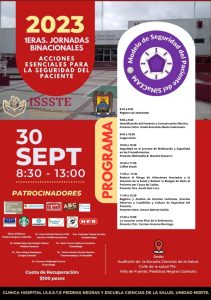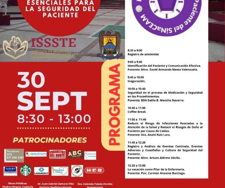 28 Septiembre 2023; Piedras Negras, Coahuila.- La Universidad Autónoma de Coahuila a través de la Escuela de Ciencias de la Salud Unidad Norte en conjunto con el Instituto de Seguridad y Servicios Sociales de los Trabajadores del Estado (ISSSTE), invita a las Primeras Jornadas Binacionales “Acciones esenciales para la seguridad del paciente”, que se llevarán a cabo el 30 de septiembre de 2023.