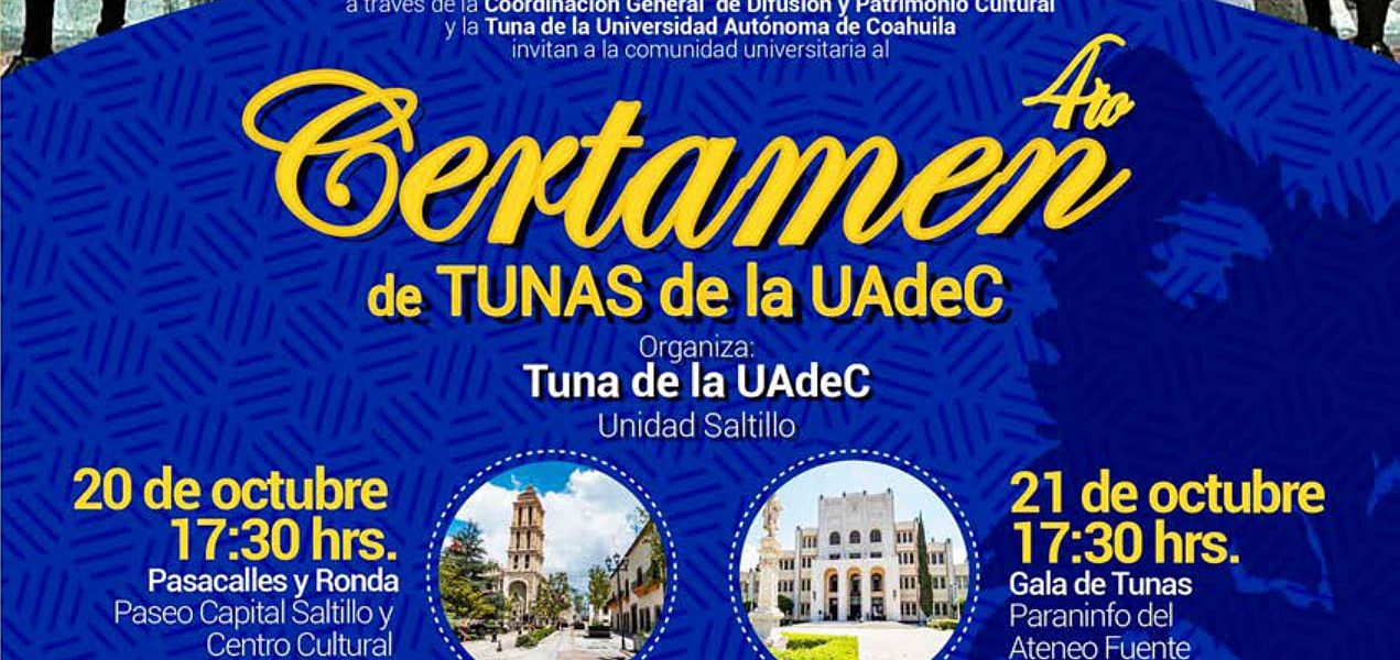 Así mismo, a las 17:30 horas dará inicio el Cuarto Certamen de Tunas de la UAdeC, que organiza la Tuna de la UAdeC Unidad Saltillo, con un Pasa Calles que iniciará en Paseo Capital Saltillo y a las 18:30 horas una Ronda universitaria en el Centro Cultural Vito Alessio Robles.
