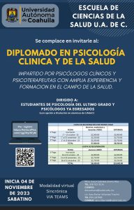 13 Octubre 2023; Piedras Negras, Coahuila.- La Escuela de Ciencias de la Salud de la Universidad Autónoma de Coahuila convoca a estudiantes de Psicología de ultimo grado y Psicólogos egresados a participar en el Diplomado en Psicología Clínica y de la Salud que se realizará de manera virtual a través de la plataforma Micrsoft Teams.