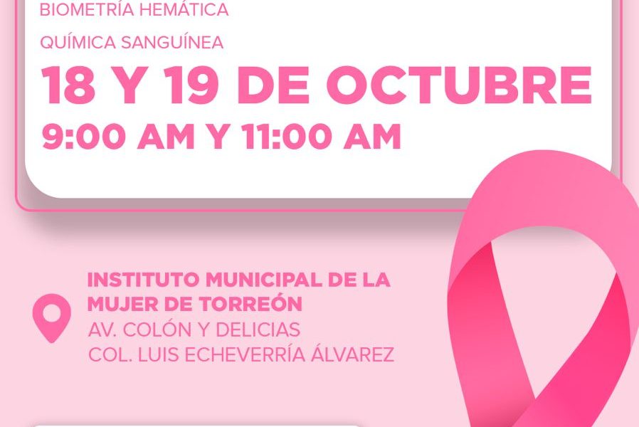 Los talleres de autoexploración y la toma de muestras de laboratorio a 200 mujeres se llevarán a cabo los dias 18 y 19 de octubre en las instalaciones del Instituto Municipal de la Mujer de Torreón. El 25 de octubre se entregarán los resultados de las pruebas, su interpretación y se ofrecerán consultas médicas gratuitas. Durante el mes de octubre se estarán brindadando, además, talleres de autoexploración en 10 empresas.