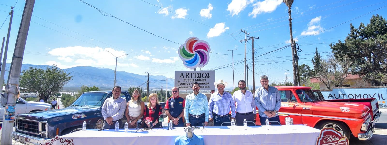 La Secretaria de Turismo y Desarrollo de Pueblos Mágicos de Coahuila, Azucena Ramos Ramos; y los alcaldes de Arteaga, Ramiro Durán, y de Cuatro Ciénegas, Manuel Humberto Villarreal, así como Luis Felipe Hernández, presidente de la Asociación, encabezaron la presentación de esta rodada de autos clásicos.