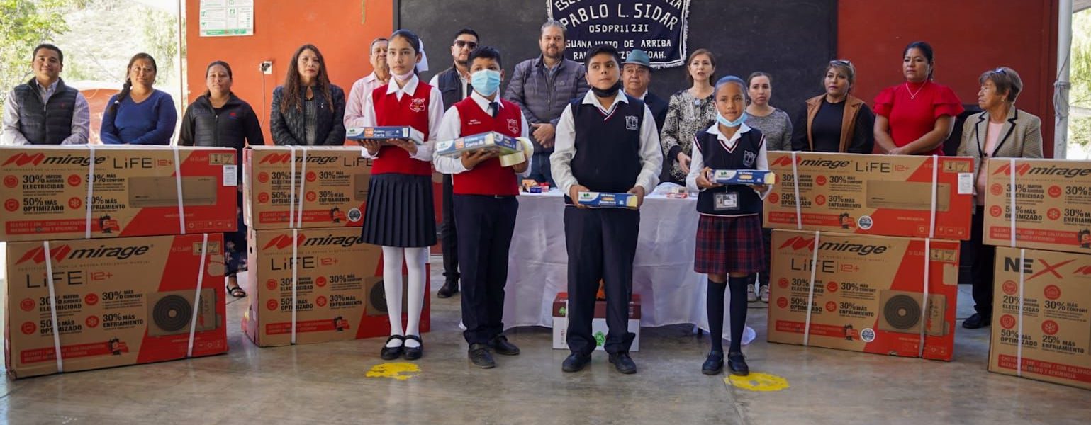 Con la representación del alcalde Chema Morales Padilla, el secretario de Desarrollo Social, Tomás Gutiérrez Merino, encabezó la entrega de seis equipos minisplit de 1.5 toneladas; una bomba centrífuga de agua, así como materiales de oficina.