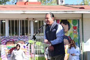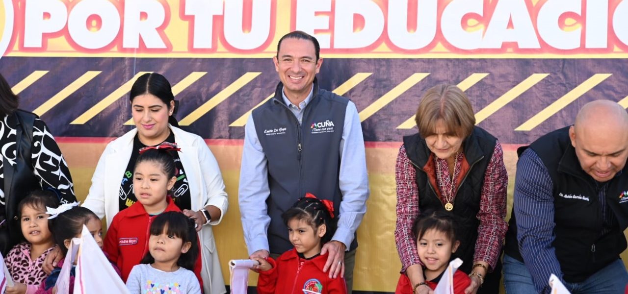 8 Noviembre 2023; Acuña, Coahuila.- Acuña cobijada por su alcalde, Emilio de Hoyos Montemayor, que siempre está presente en la educación y en nuestros niños, dijo la profesora Claudia Elizabeth López, del Jardín de Niños Griselda Álvarez Ponce de León, en el marco de supervisión de obra de cancha multideportiva.