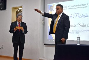 9 Noviembre 2023; Monclova, Coahuila.- El rector de la Universidad Autónoma de Coahuila, Salvador Hernández Vélez, tomó protesta a Luis Horacio Salas Torres como nuevo director de la Facultad de Contaduría y Administración Unidad Norte (UN) para el periodo 2023-2026.