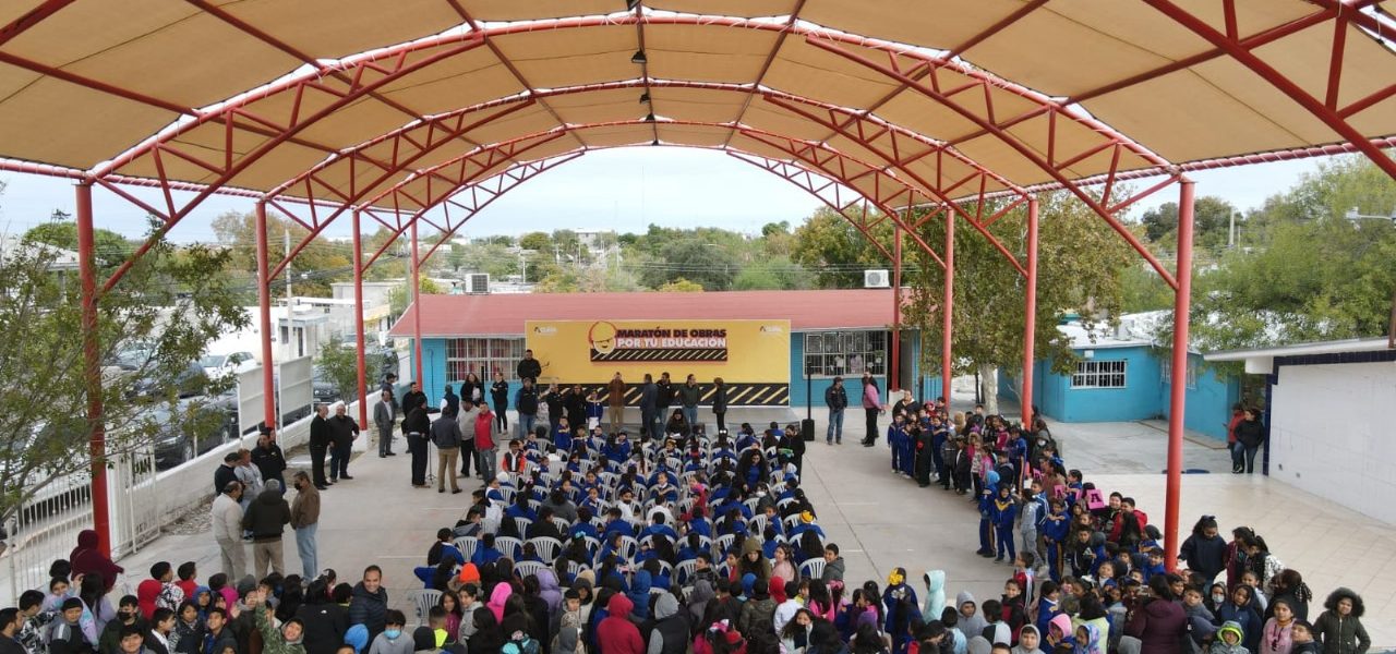 28 Noviembre 2023; Acuña, Coahuila.- Sobre estructura existente en la Escuela Primaria Ignacio Zaragoza, de la colonia Lázaro Cárdenas, el Gobierno Municipal entregó obra de rehabilitación de malla sombra de 455 metros cuadrados y una inversión de 158 mil 340 pesos.