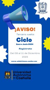 5 Diciembre 2023; Saltillo, Coahuila.- La Universidad Autónoma de Coahuila convoca a los aspirantes de bachillerato y licenciatura que presentaron el examen de admisión en octubre de 2023, a registrarse en la tercera vuelta para el semestre enero-junio 2024, cuyo registro estará disponible del 9 al 11 de diciembre en http://www.admisiones.uadec.mx.