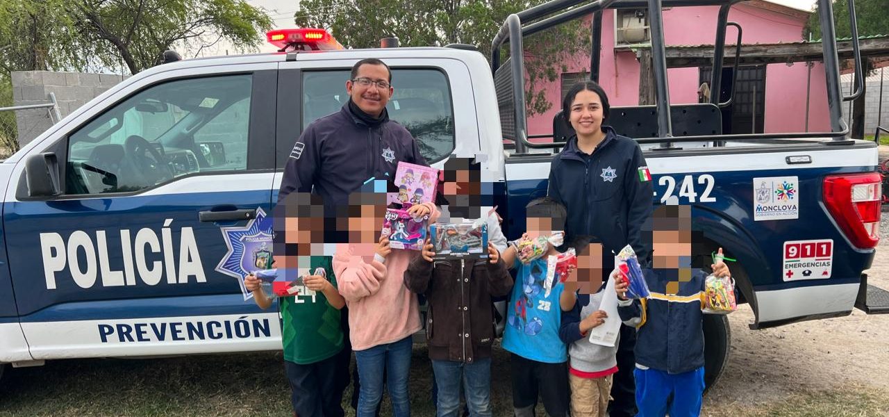 23 Diciembre 2023; Monclova, Coahuila.- Seguridad Pública Municipal, muestra su lado humano, al celebrar una alegre y animada posada sorpresa con los pequeños de la Casa Hogar Galilea, a quienes llevaron alegría, tras entregarles bolsitas con dulces, juguetes y una gran piñata, que rompieron con singular alegría.