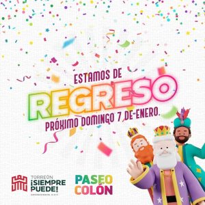 Dijo que empezarán este nuevo ciclo con una convivencia para compartir la tradicional rosca con las familias laguneras y el show infantil de Reyes Magos en el escenario principal ubicado sobre la avenida Abasolo, a partir de las 10:30 horas, aunque las actividades del Paseo Colón inician en otros módulos desde las 08:00 horas.