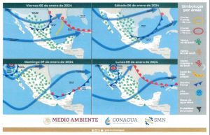8 Enero 2024; Saltillo, Coahuila.- La Subsecretaría de Protección Civil de Coahuila informó que el frente frío No. 25, al desplazarse sobre el norte y noreste de México en interacción con la corriente en chorro polar y la cuarta tormenta invernal, ocasionará lluvias con chubascos y vientos intensos con tolvaneras en la región, alcanzando rachas superiores a 100 km/h.