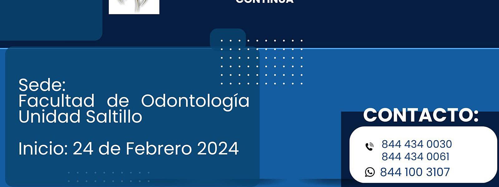 10 Enero 2024; Saltillo, Coahuila.- Para la Actualización Continua Profesional, la Facultad de Odontología Unidad Saltillo de la Universidad Autónoma de Coahuila, invita a egresados y estudiantes a cursar los Diplomados de Actualización Continua, los cuales iniciarán el 24 de febrero de 2024.