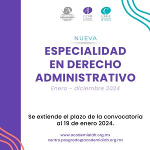 17 Enero 2024; Saltillo, Coahuila.- La Academia Interamericana de Derechos Humanos (AIDH) de la Universidad Autónoma de Coahuila, informa a profesionistas del derecho, en ciencias sociales o humanidades, que se extiende al 19 de enero el plazo para participar en el proceso de selección para ingresar a la Especialidad en Derecho Administrativo, cuyas clases inician el 26 enero de 2024.