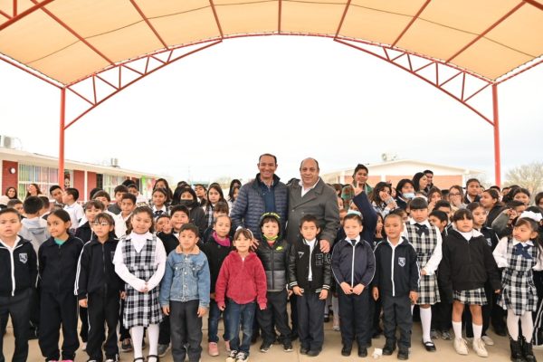 En la Escuela Primaria 18 de Marzo del fraccionamiento Valle del Sol, junto a 250 alumnos del turno matutino, maestros y su director Humberto Valasco González, cortaron el cordón inaugural de la obra que posibilitará actividades cívicas, deportivas y recreativas al aire libre del plantel a los 450 alumnos de ambos turnos.