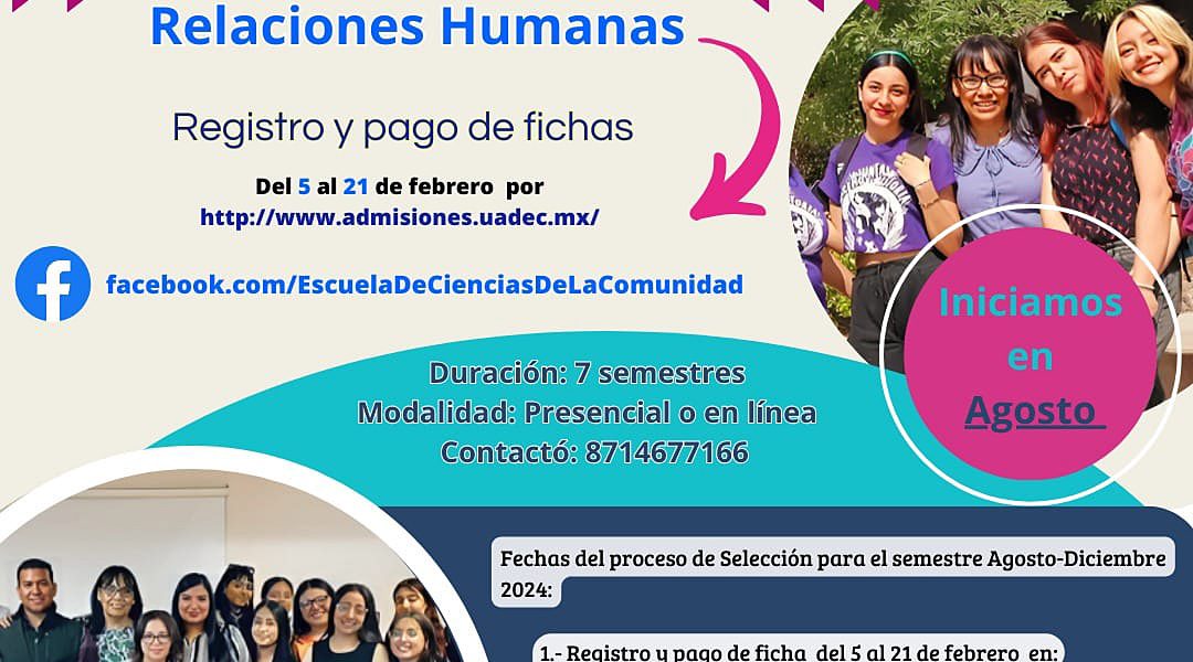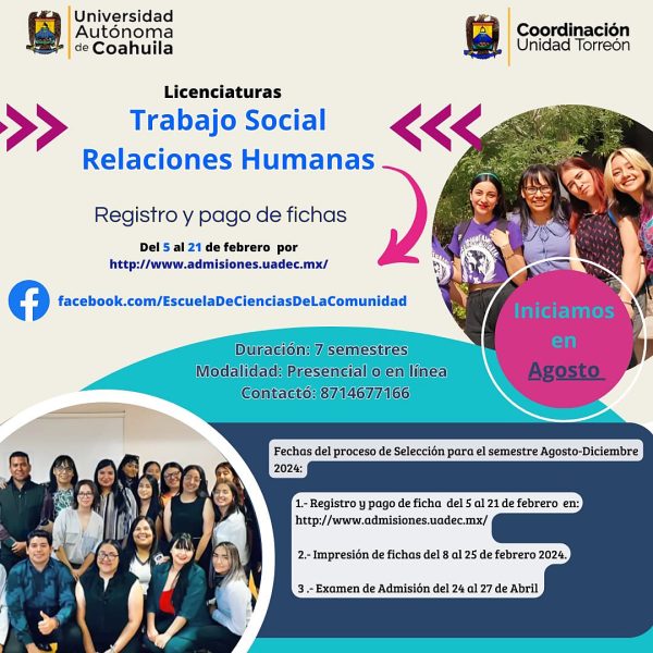 19 Febrero 2024; Torreón, Coahuila.- La Universidad Autónoma de Coahuila a través de la Escuela Ciencias de la Comunidad Unidad Torreón, invita a cursar las licenciaturas de Trabajo Social y Relaciones Humanas para el semestre agosto-diciembre de 2024.