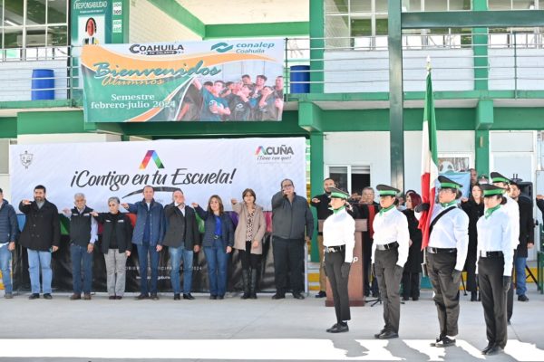 19 Febrero 2024; Acuña, Coahuila.- En el marco de apertura del semestre en el CONALEP, con ceremonia cívica de homenaje al Ejército Mexicano en su día, la Administración Municipal reactivó su programa Contigo en tu Escuela, con servicios y programas de doce dependencias municipales.