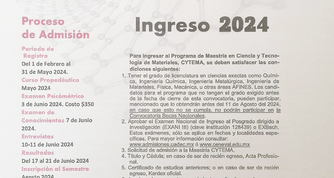 12 Marzo 2024; Saltillo, Coahuila.- La Universidad Autónoma de Coahuila a través de la Facultad de Ciencias Químicas, convoca a egresados de licenciatura en ciencias exactas como Química, Ingeniería Química, Ingeniería Metalúrgica, Ingeniería de Materiales, Física, Matemáticas o de áreas afines, a postularse para ingresar a la Maestría en Ciencia y Tecnología de Materiales para el semestre agosto-diciembre de 2024 en la página www.admisiones.uadec.mx.