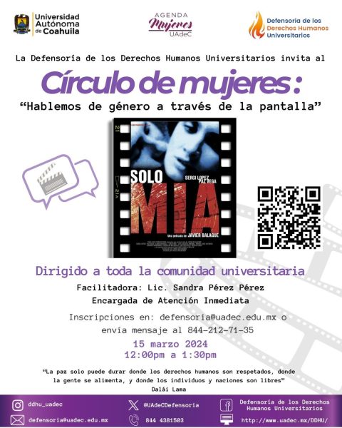 12 Marzo 2024; Saltillo, Coahuila.- La Universidad Autónoma de Coahuila, a través de la Defensoría de los Derechos Humanos Universitarios (DDHU), invita a mujeres a participar en el “Círculo de Mujeres: Hablemos de género a través de la pantalla, el cual se llevará a cabo por la plataforma Microsoft Teams el viernes 15 de marzo a las 12:00 horas.