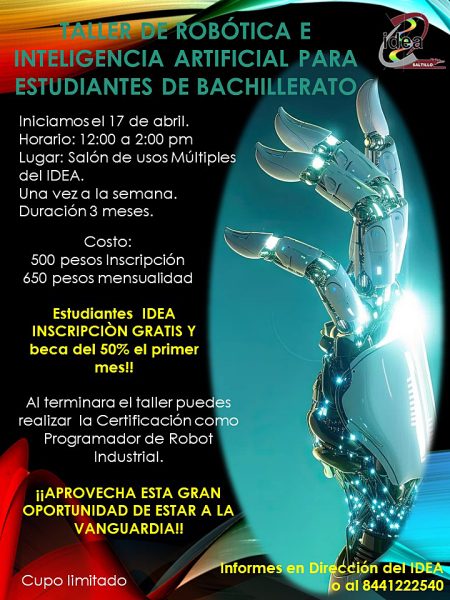 18 Abril 2024; Saltillo, Coahuila.- En el marco de las actividades por el 50 aniversario del Instituto de Enseñanza Abierta Saltillo (IDEA) de la Universidad Autónoma de Coahuila, en coordinación con REK México, dio inicio al Taller de Robótica e Inteligencia Artificial, iniciativa que busca fomentar el interés por la tecnología y preparar a los estudiantes de bachillerato para los desafíos del futuro.