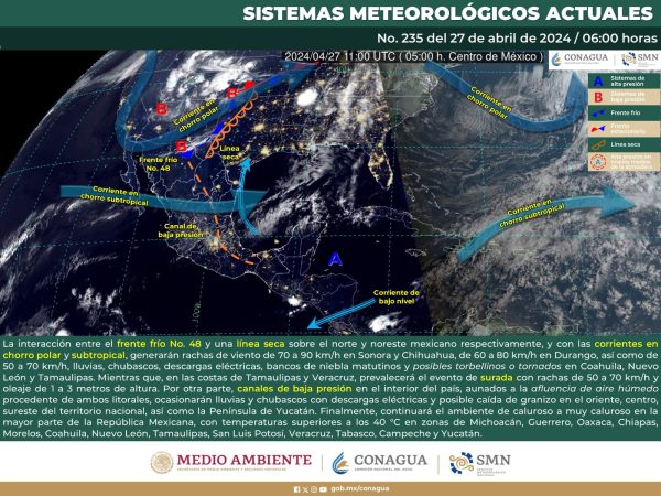 27 Abril 2024; Saltillo, Coahuila.- La Subsecretaría de Protección Civil del Estado (PC) informó que hoy sábado, la interacción entre el frente frío número 48 y una línea seca sobre Coahuila generará fuertes rachas de viento, lluvias, chubascos, descargas eléctricas, bancos de niebla matutinos y posibles torbellinos o tornados.