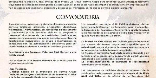 INVITAN A PARTICIPAR EN LA PRESEA “MIGUEL RAMOS ARIZPE”