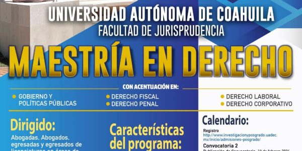 Convoca la Facultad de Jurisprudencia de la UAdeC a Estudiar la Maestría en Derecho con Cinco Acentuaciones
