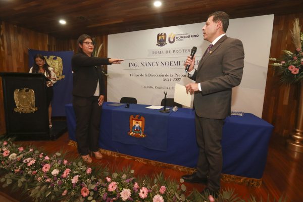 14 Mayo 2024; Saltillo, Coahuila.- El rector de la Universidad Autónoma de Coahuila, Octavio Pimentel Martínez, tomó protesta a Nancy Noemí Torres Ríos como directora de la Preparatoria Número Uno y al Jonathan Flores Pérez como director de la Facultad de Economía, para el periodo 2024-2027.