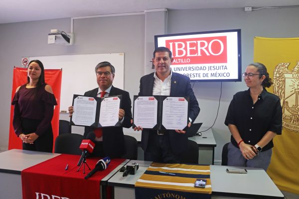 El documento fue firmado por el rector de la UAdeC, Octavio Pimentel Martínez y el rector de la Universidad IBERO Región Noreste, Juan Luis Hernández Avendaño, en una ceremonia que contó con la presencia de la coordinadora general de Vinculación e Innovación Productiva de la UAdeC, Karla Valdés García y la directora general de la IBERO Saltillo, Bianka Obando Proo.