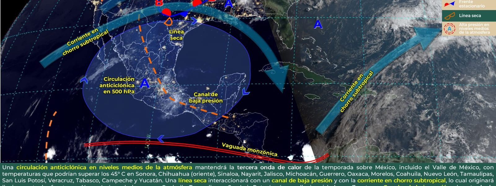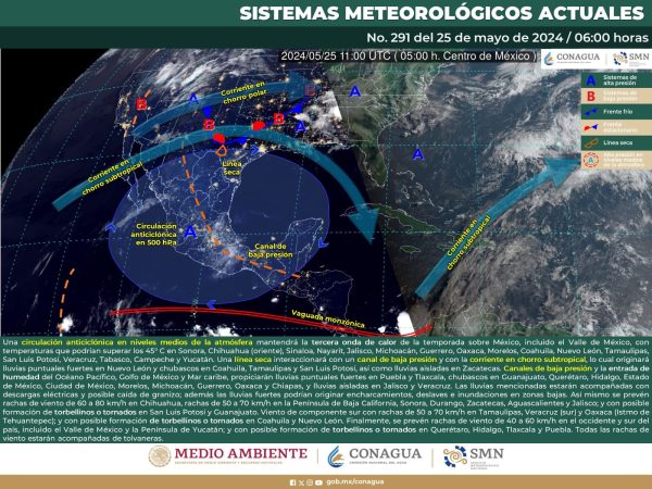25 Mayo 2024; Saltillo, Coahuila.- La Subsecretaría de Protección Civil del Estado (PC) ha informado que este sábado persistirá una circulación anticiclónica en niveles medios de la atmósfera, manteniendo la tercera onda de calor de la temporada con temperaturas que podrían superar los 45° C.