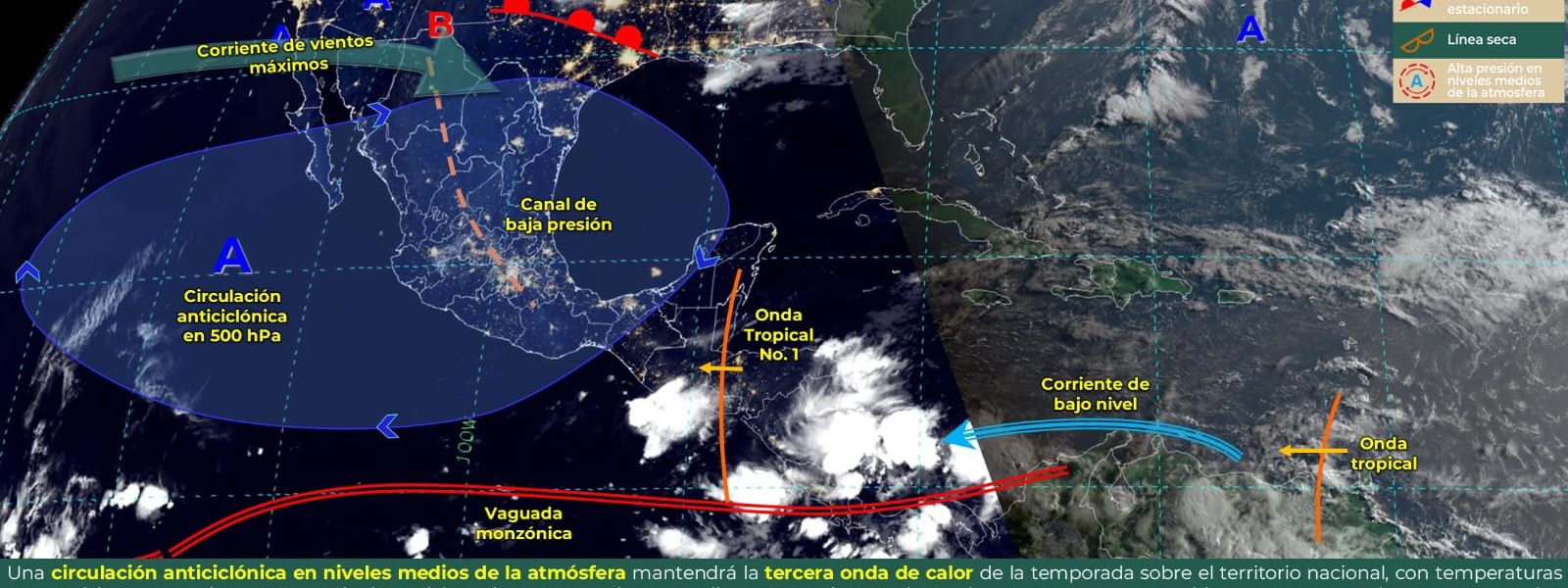 Además, se prevén condiciones climáticas adversas debido a una línea seca sobre el norte del país que, al interactuar con la humedad del Golfo de México y la inestabilidad en niveles altos de la atmósfera, generará chubascos y lluvias intensas.