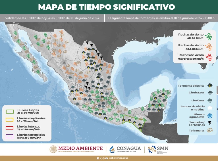 Además, desde hoy hasta el lunes 3 de junio, la combinación de una línea seca, aire inestable superior e ingreso de humedad dará lugar a chubascos vespertinos y lluvias fuertes. Estos fenómenos estarán acompañados de descargas eléctricas y posible caída de granizo de diversos tamaños, así como de vientos fuertes a muy fuertes.