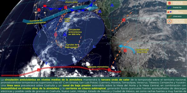 CONTINUARÁ LA ONDA DE CALOR. ADEMÁS, SE PREVÉN LLUVIAS PUNTUALES FUERTES CON POSIBLE FORMACIÓN DE TORBELLINOS O TORNADOS EN COAHUILA