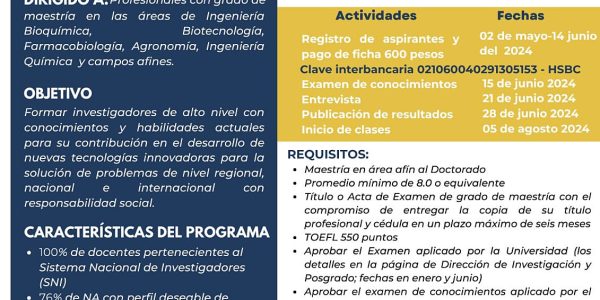 Cursa en la UAdeC el Doctorado en Ingeniería Bioquímica Por Alberto Casas 8 Mayo 2024; Torreón, Coahuila.- La Universidad Autónoma de Coahuila, a través de la Facultad de Ciencias Biológicas Unidad Torreón, convoca a profesionales con grado de maestría en…